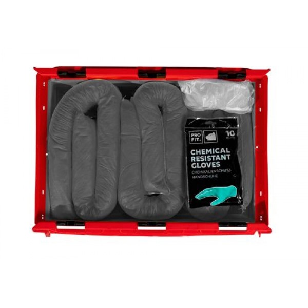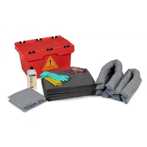 škatla z dvokrilnim pokrovom na tečajih je jasno zapakirana z vsemi pomembnimi veznimi materiali in osebno zaščitno opremo za profesionalno zadrževanje nevarnosti,