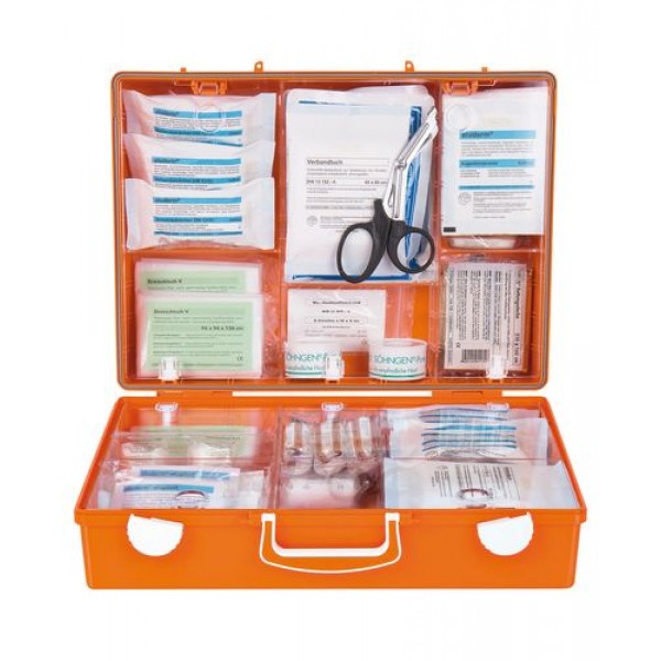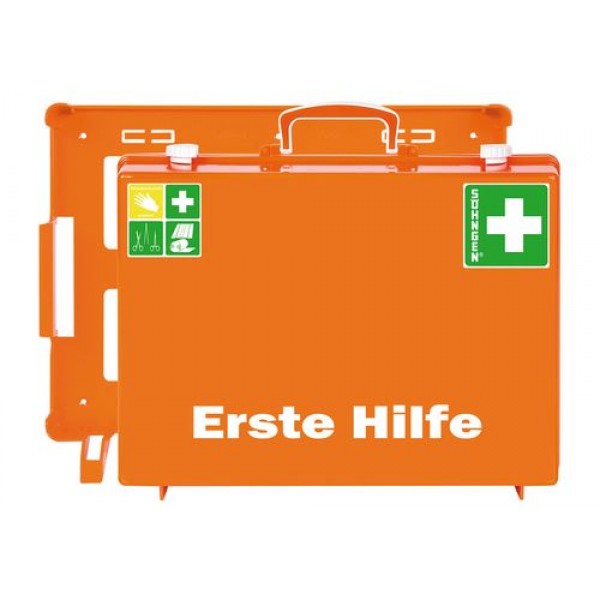 Komplet za prvo pomoč s polnilom po DIN 13169, iz ABS plastike, s stenskim nosilcem, oranžna